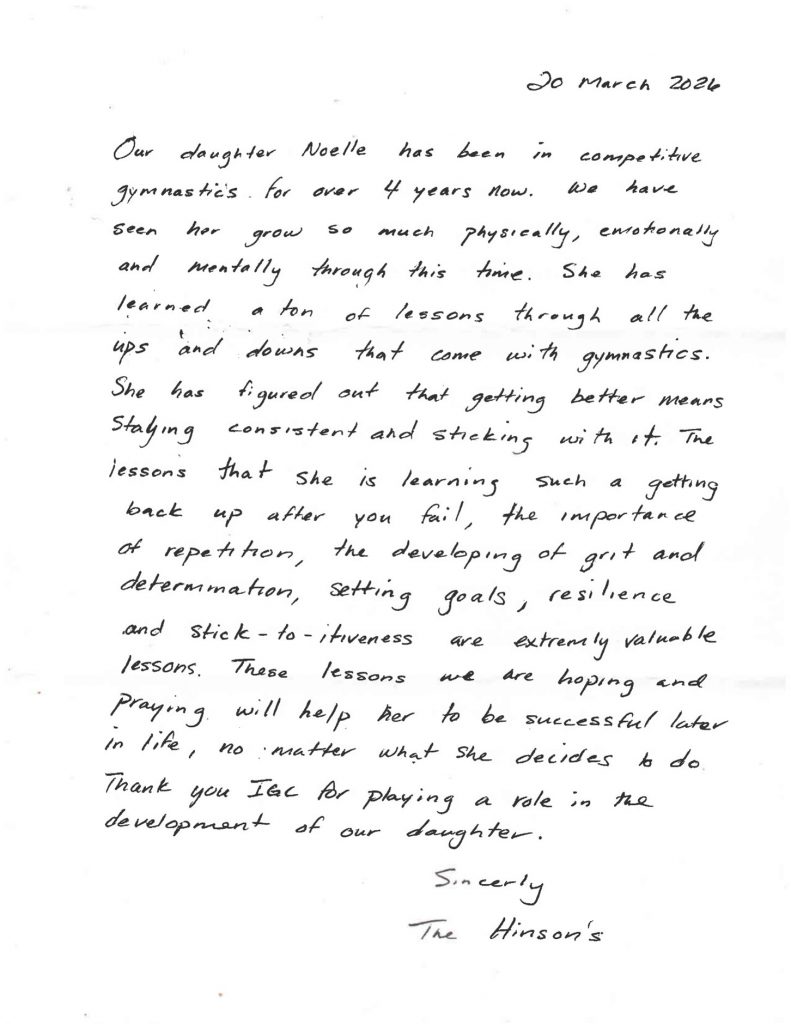 “Watching our daughter grow through her journey with Infinity Gymnastic competitive team has been nothing short of amazing. From the moment she started we’ve seen so much growth. Gymnastics has taught her to work hard, never give up, and believe in herself even when things get tough. She’s learned to face her fears, perform with confidence, and push for her goals.